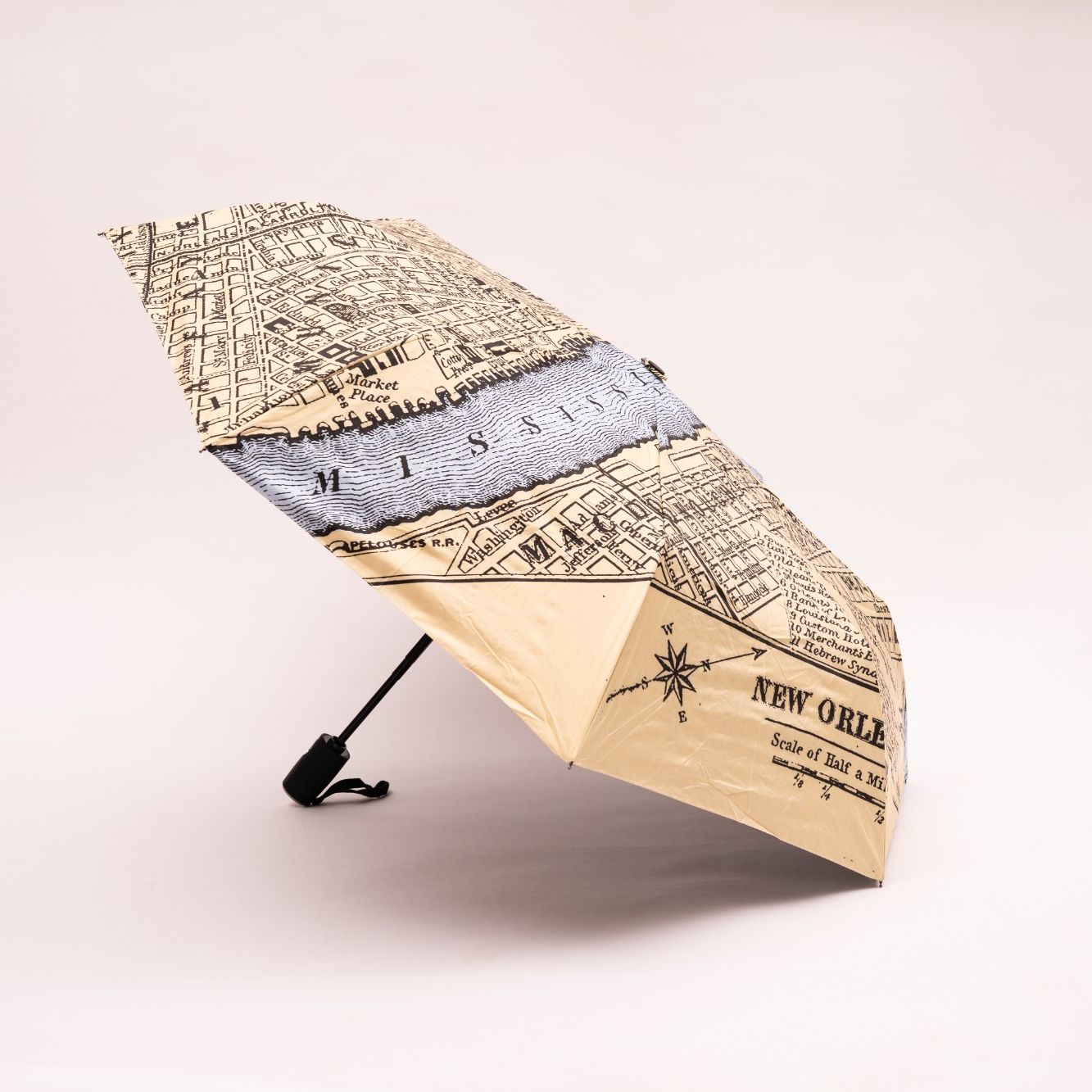 Our City of New Orleans Vintage Map Beige Umbrella features an auto open/close button for easy access.