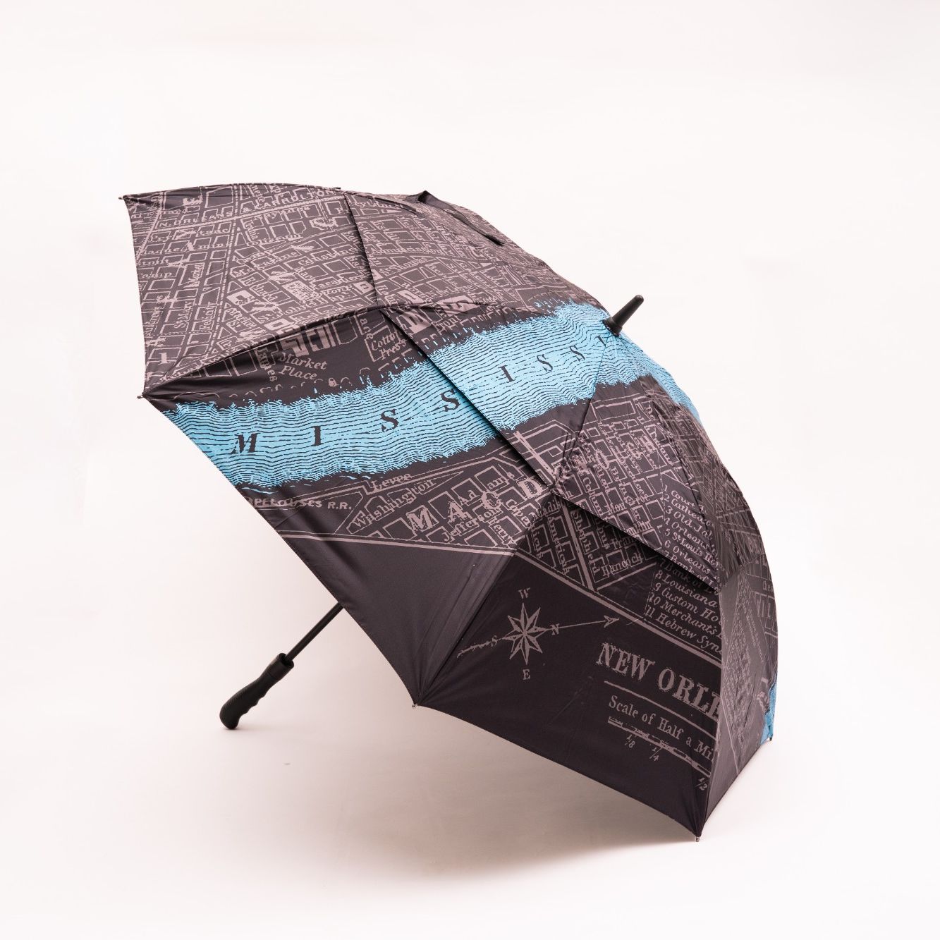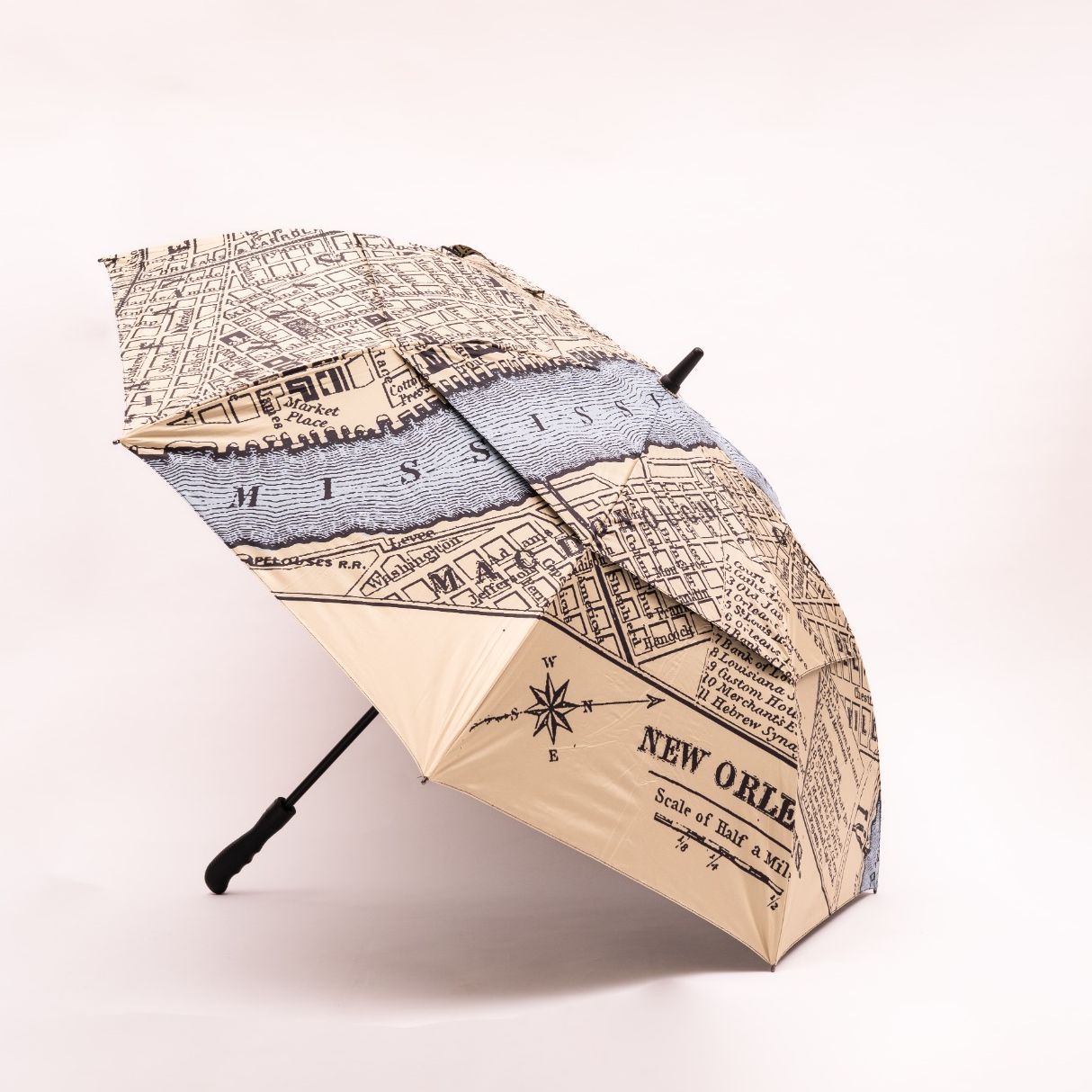 Our City of New Orleans Vintage Map Golf size umbrellas are available in beige or black. Feature auto open double layers air vented with a black UV liner.