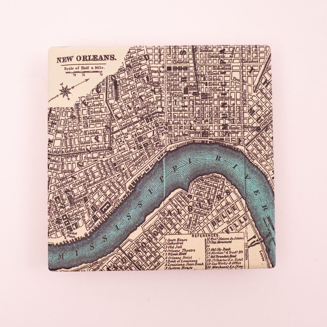 Our City of New Orleans Vintage Map Coasters are printed on ceramic tiles with a cork bottom.